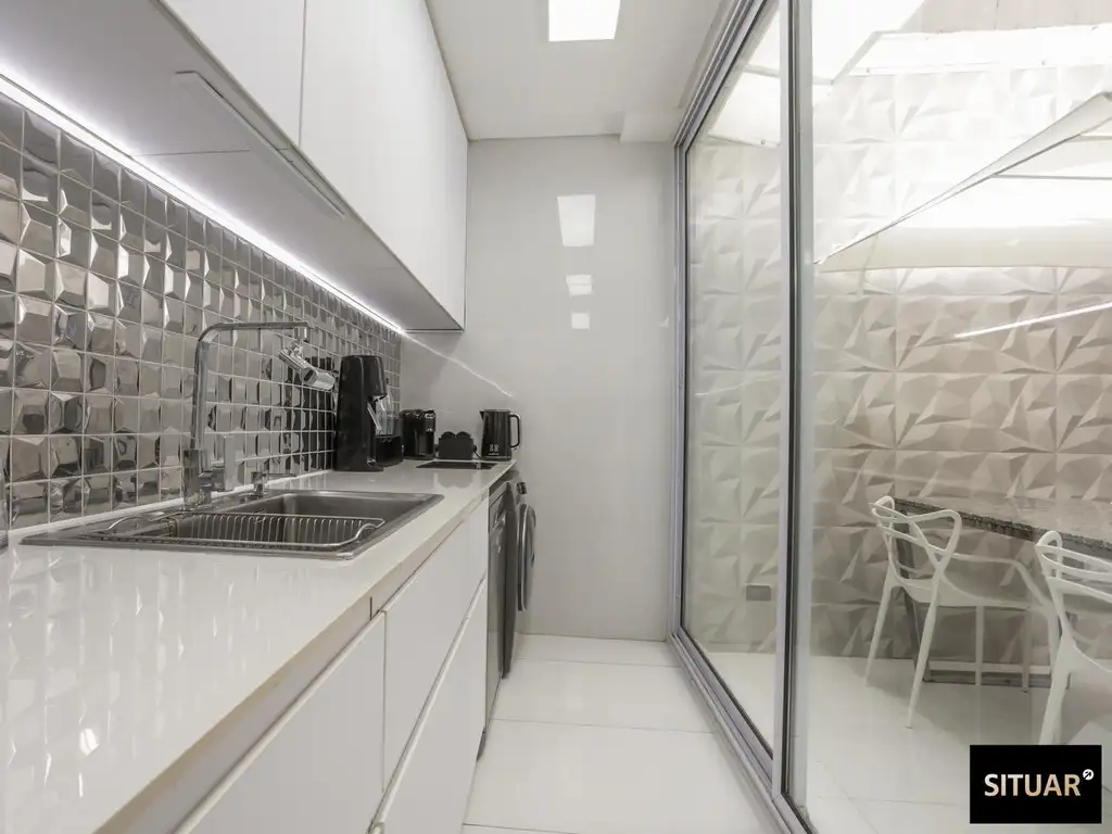 Cocina de paredes revestidas, con mesada infinita de Neolith equipada con Anafe de Inducción (incluye las ollas).