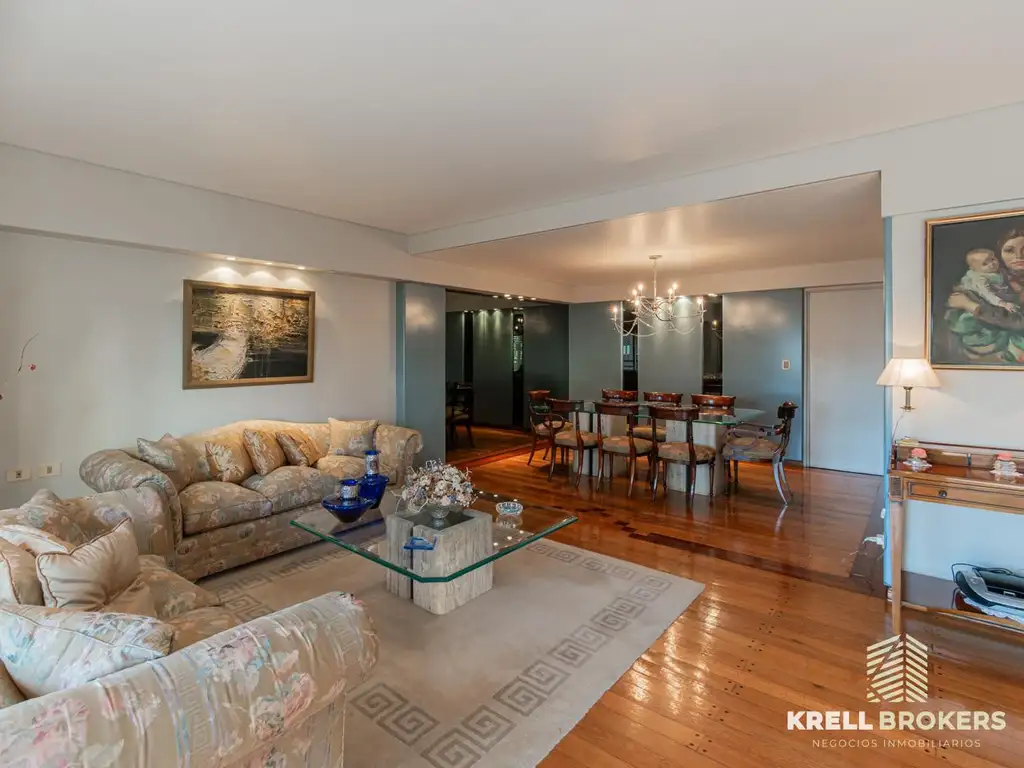 Palier privado al frente, pisos entarugados de roble, doble circulacion, Living comedor en L con muebles empotrados de diseño.