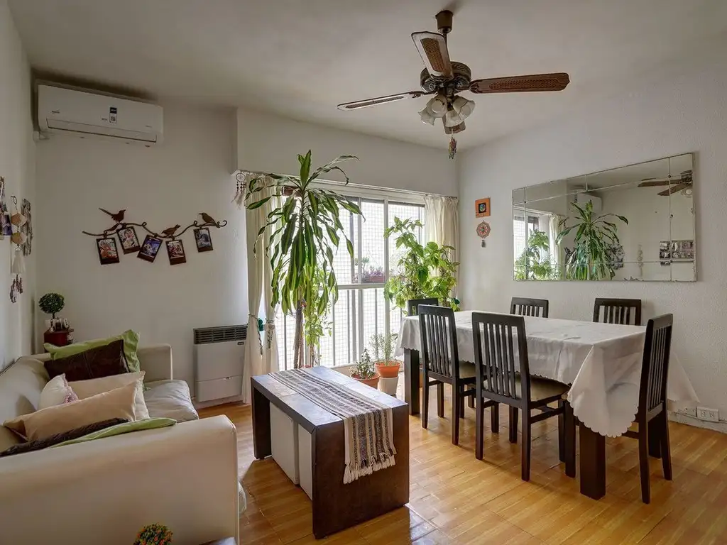 El living comedor tiene pisos de vinilo simil madera, ventana con balcón francés al lateral y ventilador. Tiene conexión para estufa.