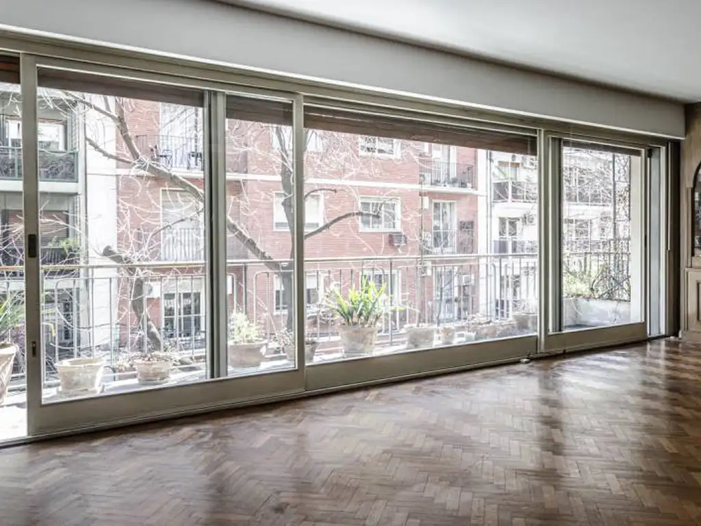Recepción con doble frente a balcón corrido. Comedor. Escritorio a aire y luz. Toilette. Tres dormitorios, dos de ellos al contrafrente. Baño doble compartimentado. Cocina con office. Dependencia y baño de servicio. Lavadero. Cochera espacio y baulera. Calefacción central por radiadores y pisos de parquet.