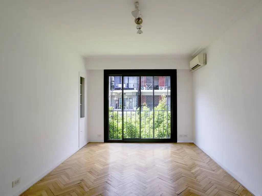 Departamento de tres ambientes con dependencias. Los tres ambientes al frente, muy luminosos, con orientación Noreste y vista sobre la copa de los árboles. Placard de recepción. Living comedor con ventanal. Dos dormitorios con placards. El dormitorio principal con ventanal y salida a balcón. Un baño completo reciclado. Cocina, lavadero separado. Dependencias de servicio con baño reciclado. Aberturas recicladas en todos los ambientes. Pisos de parquet. Aires acondicionados Split en living comedor y dormitorio principal. Calefacción central por losa radiante. Puerta principal y puerta de servicio. Baulera. Encargado no permanente, sin vivienda. Expensas muy bajas. — Las medidas son aproximadas y orientativas. Las medidas exactas surgirán del título de propiedad.