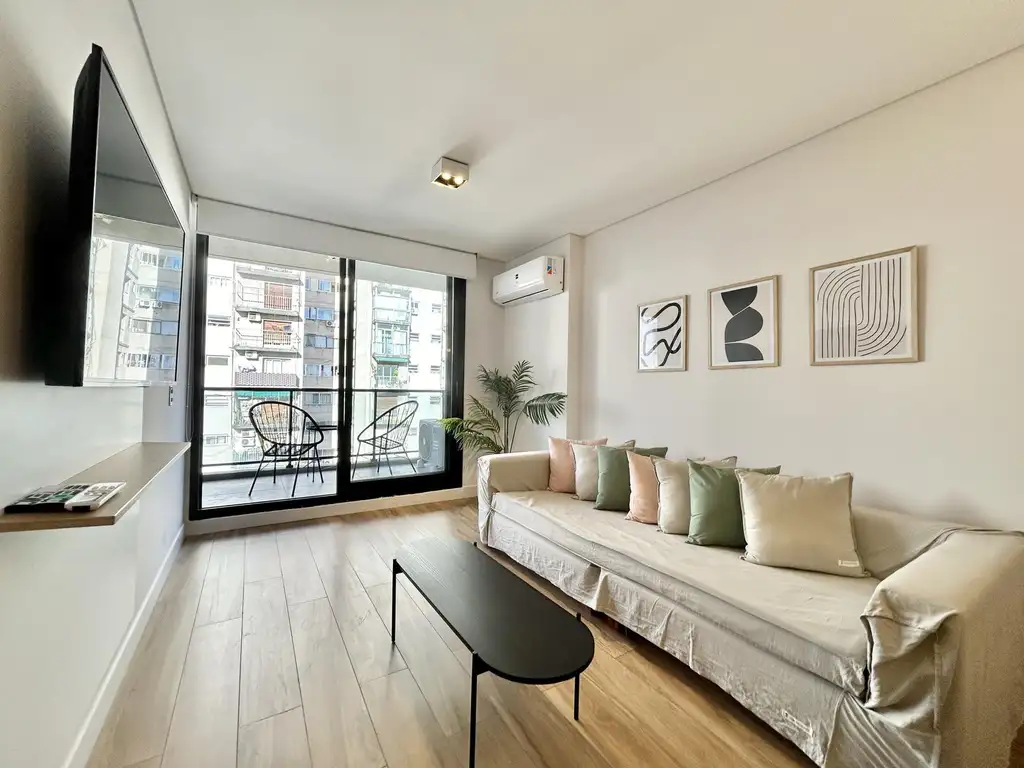 Hall de entrada. Toilette y placard de recepción. Amplio living comedor con salida a balcón corrido al contrafrente. Cocina con mesada de silestone, anafe vitrocerámico, horno eléctrico, espacio para microondas y lavarropa, y muebles completos en melamina de diseño contemporáneo. Dormitorio con baño en suite, dos placares y salida a balcón. Equipo de aire acondicionado frío/calor en living y dormitorio. Baño completo con mesada de silestone, con bacha cerámica de apoyar y revestimiento de primera calidad. Bauleras opcionales.