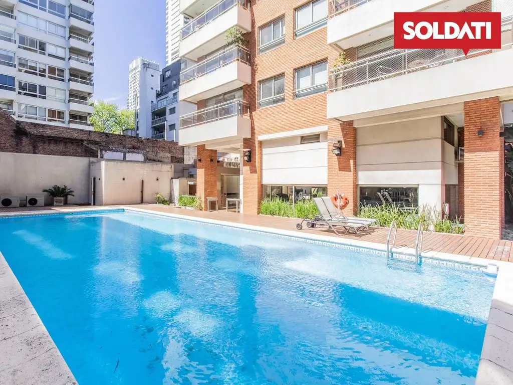 El departamento da al contrafrente, posee una vista hermosa, ya que puede apreciarse la gran piscina descubierta rodeada por un deck de madera de gran calidad, cuenta con reposeras modernas y puede observarse las altas palmeras que se encuentran apoyadas sobre la pared medianera de gran altura, creando un ámbito de gran privacidad y un muy elegante marco.