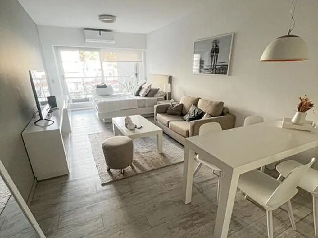 Decorado y equipado. Hall de entrada con placar con frente sin interiores. Amplio ambiente cocina americana con anafe y horno eléctricos, y muebles completos. Balcón corrido al contrafrente. Baño completo. Puerta ventana con vidrios DVH. Split Frío/Calor con tecnología inverter instalado. Pisos de porcelanato símil madera. (Fotos de una unidad similar ocupada).