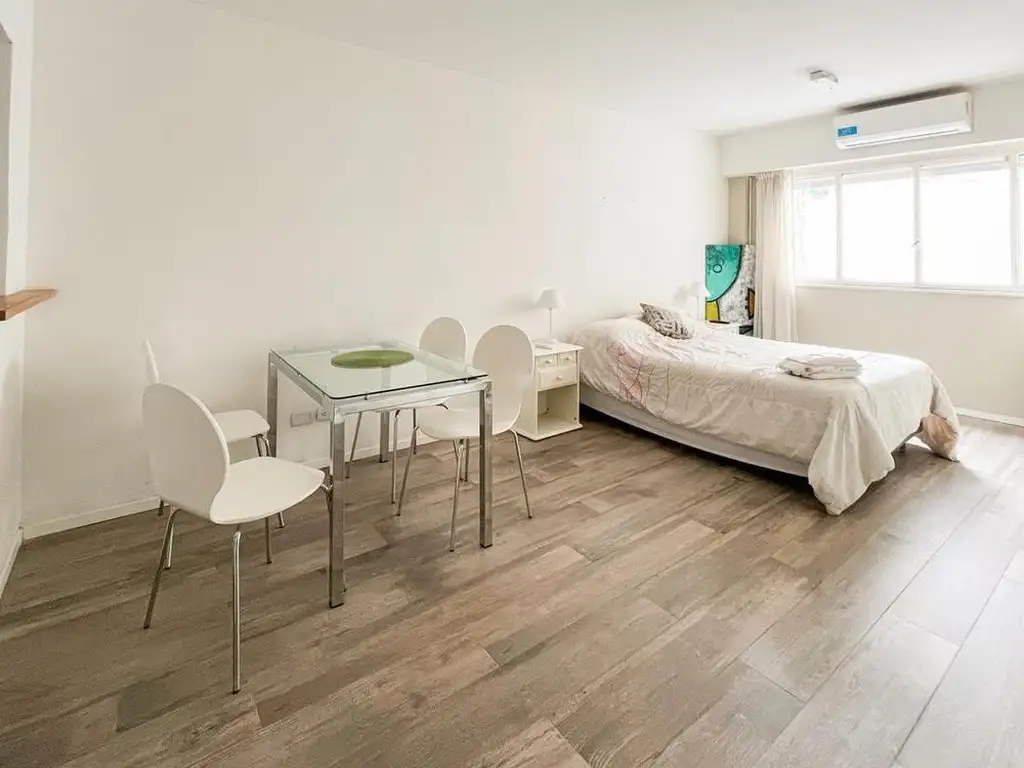 Departamento monoambiente con pisos de porcelanato símil madera cambiados recientemente. Cuenta con un equipo de aire acondicionado frío/calor.