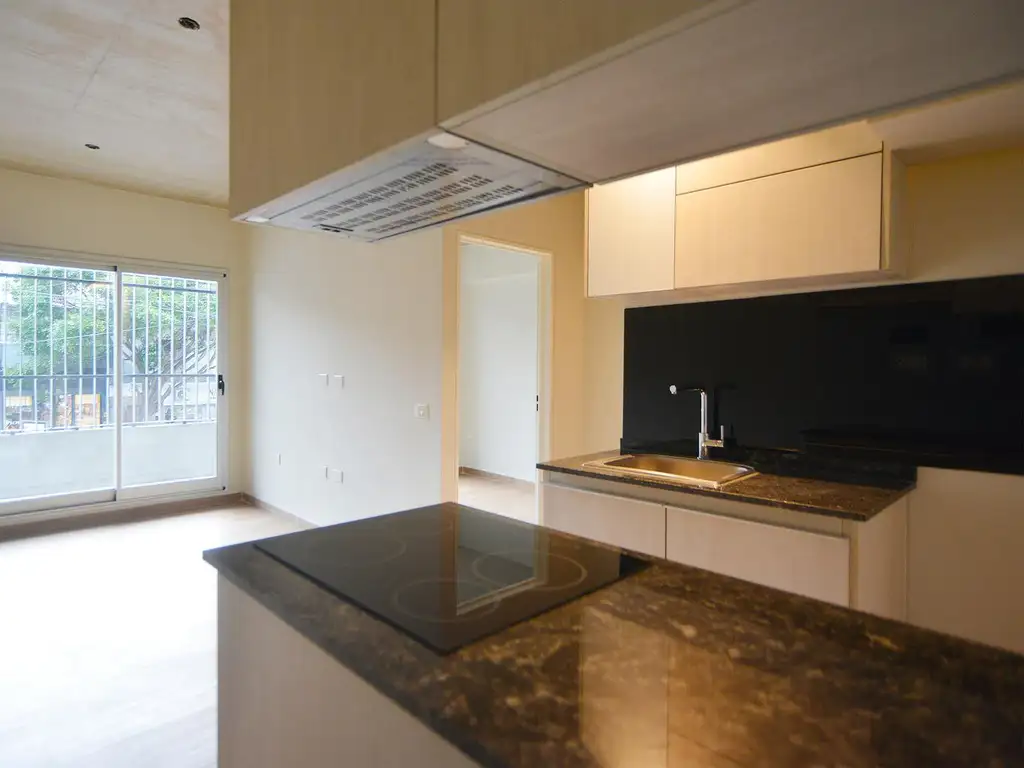 Anafes vitrocerámicos y hornos empotrados, con mesada de granito color negro boreal y fondo de mesada con vidrio negro de 60cm de alto. Muebles bajomesada y alacenas realizados con las melaminas touch más actuales. Herrajes de calidad. Bacha de acero inoxidable, y grifería marca Hidromet modelo Discovery, monocomando, pico recto. Conexión para lavarropas.
