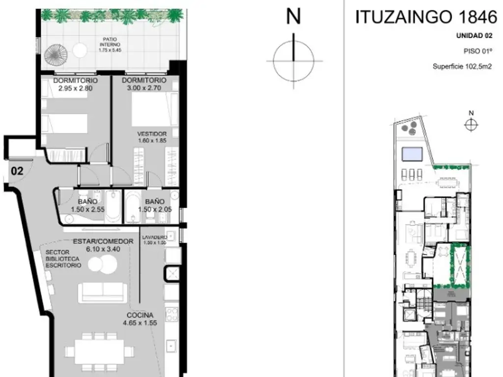 01-02. Dos dormitorios, con cochera SS 08.78 m2 cubierto, 11,50 m2 semicub, 13 m2 patio, 12,50 m2 cochera. 115,00 m2 totales.