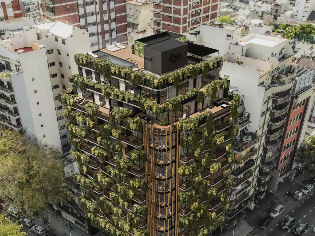 El edificio cuenta con terminaciones de categoría: losa de hormigón visto en livings y comedores, calefacción frío-calor, iluminación colocada en áreas comunes, balcones y terrazas, grupo electrógeno, dos ascensores de última tecnología, vegetación con riego automático y parrillas privadas en los balcones.