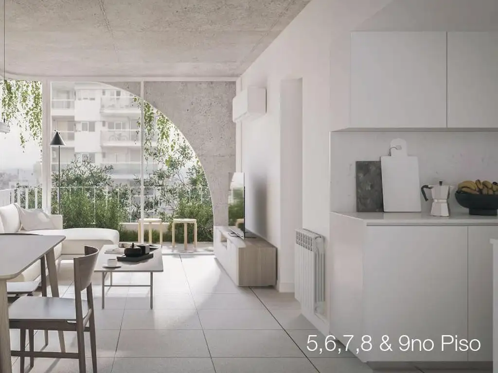 agua caliente sanitaria a través de calefón a gas Longvie. Previsión de instalación de gas para estufa. Instalación de cañerías para equipos de aire acondicionado split (no incluye equipos). Muros dobles con aislación térmica 3cm alta densidad. Cubiertas con aislación térmica 4cm alta densidad y hormigón de pendiente alivianado con perlitas de poliestireno expandido. - Pisos: Hall de Ingreso | Palieres: Porcelanato ILVA / VITE / CERRO NEGRO 60x60cm. o calidad similar. Espacios Comunes: Porcelanato ILVA / VITE / CERRO NEGRO 60x60cm. o calidad similar. Exteriores: Pavimento intertrabado Pavitec o calidad similar. Ingreso cocheras: Loseta granítica Blangino. Baños: Porcelanato ILVA / VITE / CERRO NEGRO 60x60cm. o calidad similar. Cocina | Lavaderos: Porcellanato CERRO NEGRO 60x60cm. o calidad similar. Estar | Comedor: Piso cerámico CERRO NEGRO 60X60 cm o calidad similar. Dormitorio: Pisos SPC Símil Madera. - Revestimientos: Cocinas | Lavaderos: Sobre mesada y bajo mesada Net Plus Blanco o calidad similar. Terminaciones con cantos de acero inoxidable. Baños: Porcelanato Blanco 60x30 Portinari. Detalles en venecitas y terminaciones con cantos de acero inoxidable. - Carpintería metálica: Aberturas de aluminio HYDRO Nordical, anodizado color natural y/o negras. VIDRIOS DVH de alta prestación. Ingreso palier PB: Puerta pivotante marco acero inoxidable y vidrio de seguridad. - Placares y Muebles de Cocina: Placares con interiores completos: Puertas corredizas en melamina texturizada con guías de aluminio. Equipamiento de cocina MDP enchapado melamínico blanco, cantos de PVC 2mm y sistema de apertura perfil Gola aluminio anodizado natural. Sistema de cierre suave. - Yesería: Enlucido de yeso en paramentos interiores. Cielorrasos de yeso aplicados a la losa con buña perimetral y suspendidos en baños y cocinas. - Artefactos: Cocina: Cocina a gas Longvie/Whirlpool o calidad similar. Pileta bacha Q40 Johnson Aceros (monoambiente) Pileta doble bacha R63/18 Johnson Aceros (1 Dormitorio) Baños: Bacha Ferrum Blanca Cuadrada o calidad similar