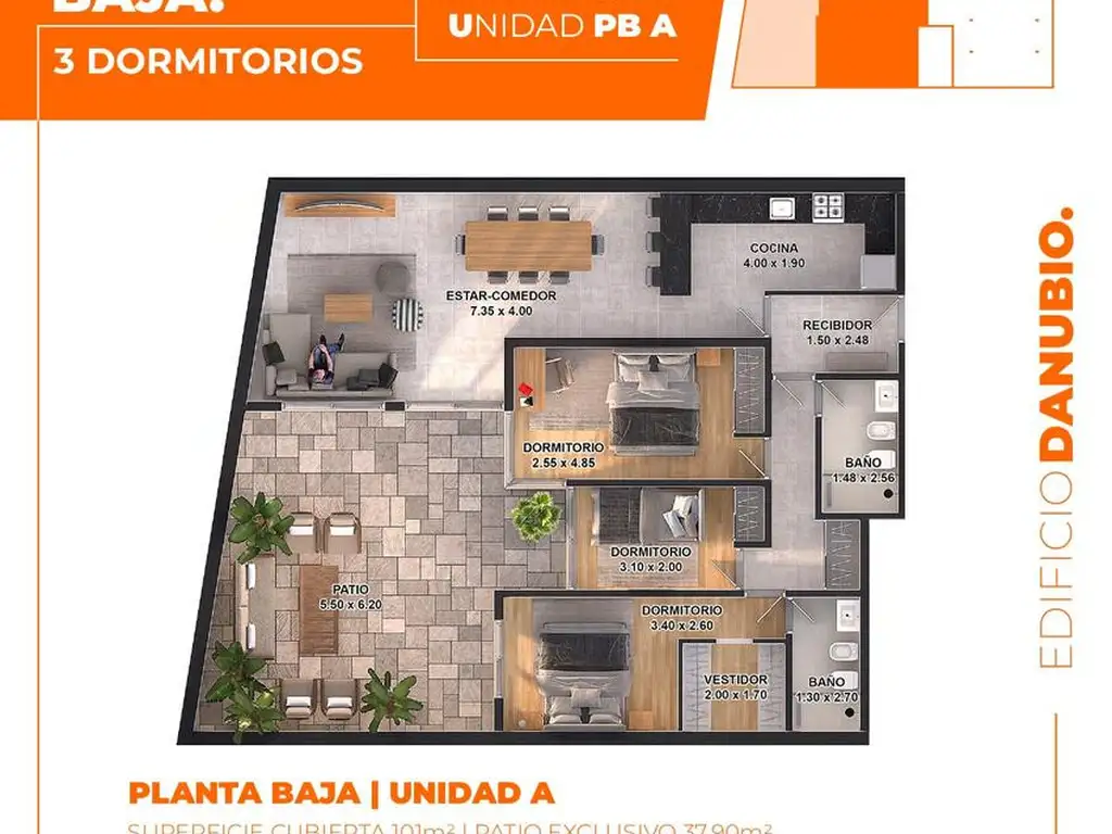 El departamento esta ubicado con Plana Baja , es la única unidad de 3 dormitorios con patio y parrillero en el edificio.