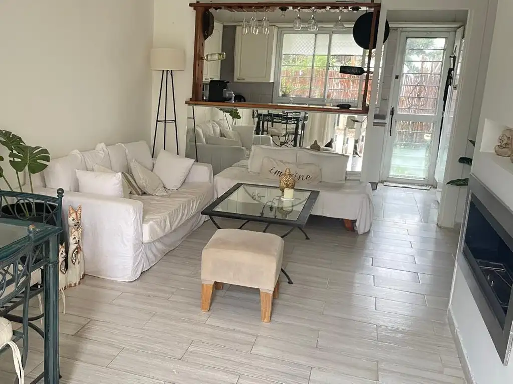 Planta baja: living-comedor, cocina con barra, amplio guardado bajo escalera, toilette y patio trasero con parrilla. Pisos cerámicos tipo madera patinada blanca.