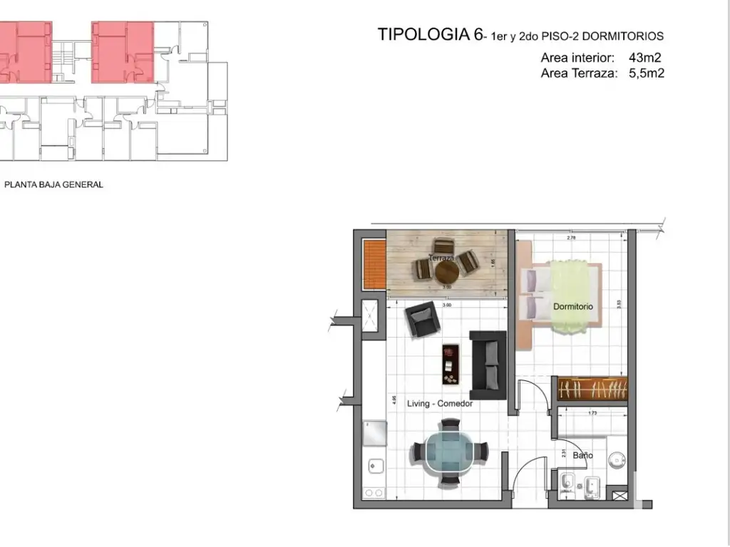 1 dormitorios, 1 baño, living-comedor con cocina integrada. Terraza con parrillero.