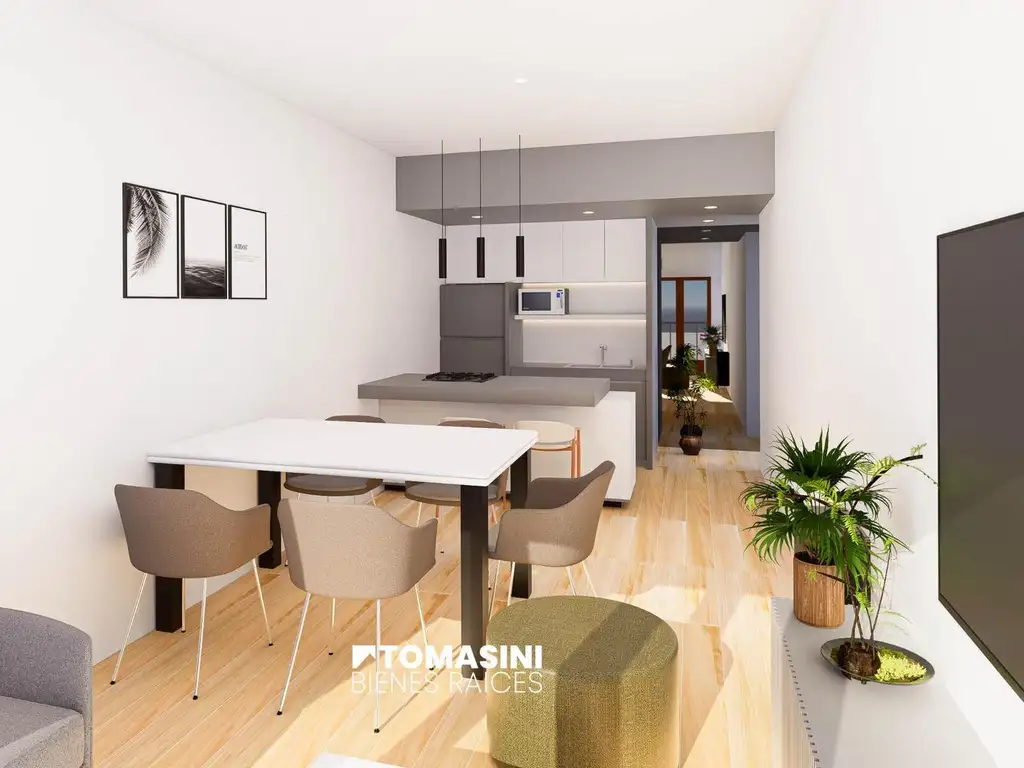La cocina integrada con barra desayunadora combina diseño y funcionalidad, mientras que el dormitorio con pisos de parquet y el baño con ventilación natural aportan calidez y confort.