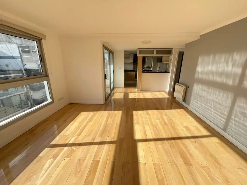 Al ingreso, encontramos un amplio living apaisado con pisos de madera tarugada plastificada y con salida al balcón.