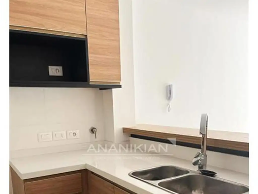 Moderna cocina semi equipada incorporada al living con excelentes placares y barra