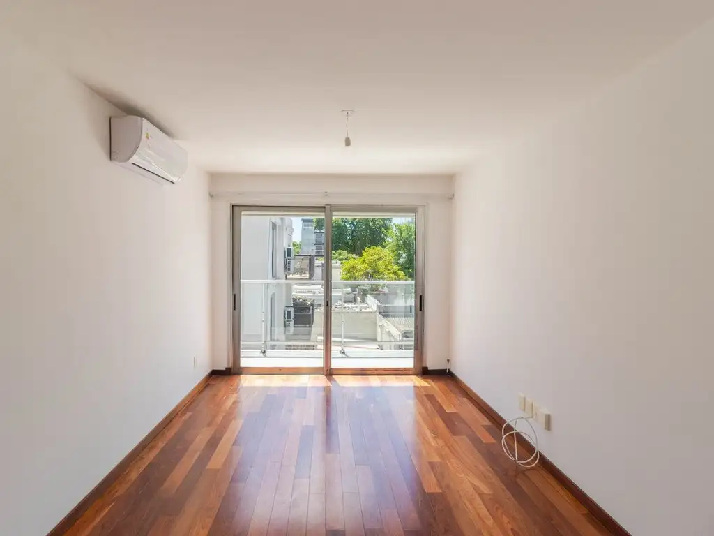 El dormitorio con gran ventanal también tiene salida al balcón que permite la entrada de luz natural y cuenta con aire acondicionado. Del dormitorio se accede a un vestidor con acceso a baño completo.
