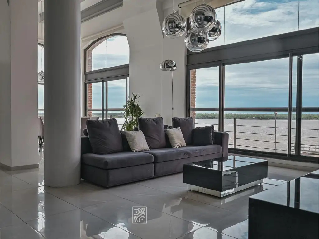 Departamento de 4 dormitorios, distribuido en dos plantas. Todos los ambientes de la unidad cuentan con vista al rio. La planta baja se distribuye en ingreso a living comedor, cocina integrada, baño completo, lavadero, dormitorio principal con baño en suite y segundo dormitorio. Una vista al rio única en la ciudad. El acceso a planta alta es a través de una escalera con barandas de cristal y tenemos un pasillo distribuidor que conecta los dos dormitorios de planta alta además de un pasillo tipo puente con pisos de madera natural, que ofrece una vista a toda la unidad con el rio de fondo. La unidad fue intervenida hace 3 años. El valor incluye una cochera en sub-suelo. El complejo cuenta con seguridad presencial en el ingreso las 24hs.