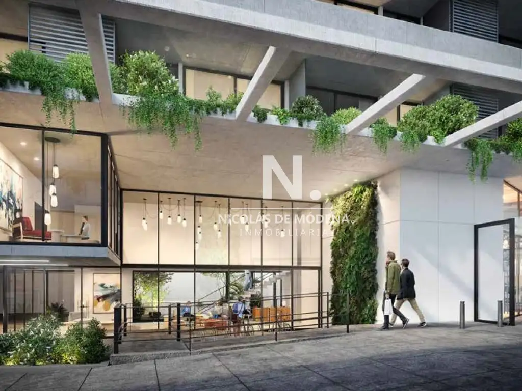 Sobre una esquina, con tres fachadas despejadas 01 Libertador despliega imponentes lozas irregulares que sirven de bandeja para sus jardines.