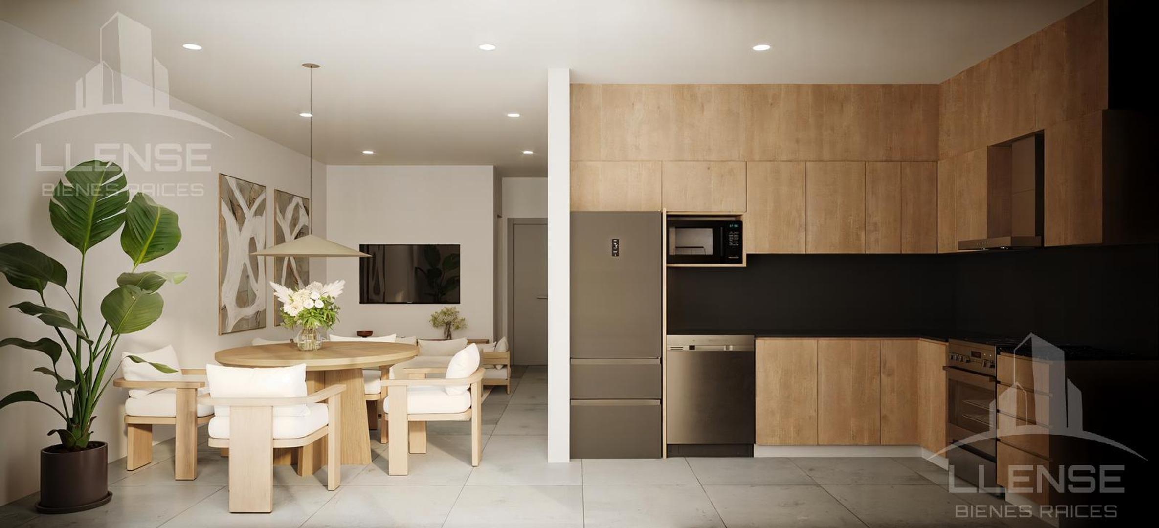 Cocina integrada, living - comedor.