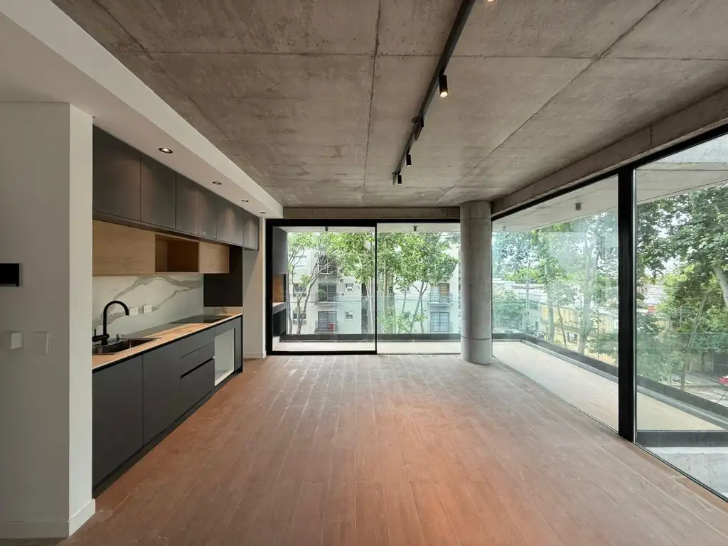 Este encantador departamento de tres ambientes, ubicado en el segundo piso, te da la bienvenida con un espacioso y luminoso ambiente que integra el living, la cocina y el comedor. La perfilería de piso a techo en elegante color negro crea una sensación de amplitud y luminosidad en todo el espacio. Desde aquí, se accede al balcón en esquina, que cuenta con una parrilla y está rodeado de vegetación, creando un ambiente tranquilo para disfrutar al aire libre.