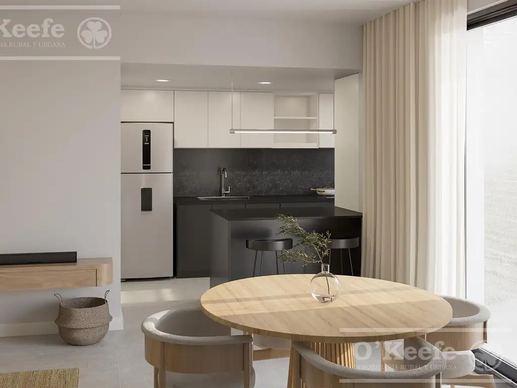 El living/comedor (6.97 x 4.00) se conecta al balcón exterior. La cocina es independiente y está equipada con mesadas de Purastone y muebles de melamina sobre MDF. Calidad constructiva con pisos de porcelanato y carpinterías de aluminio con DVH.