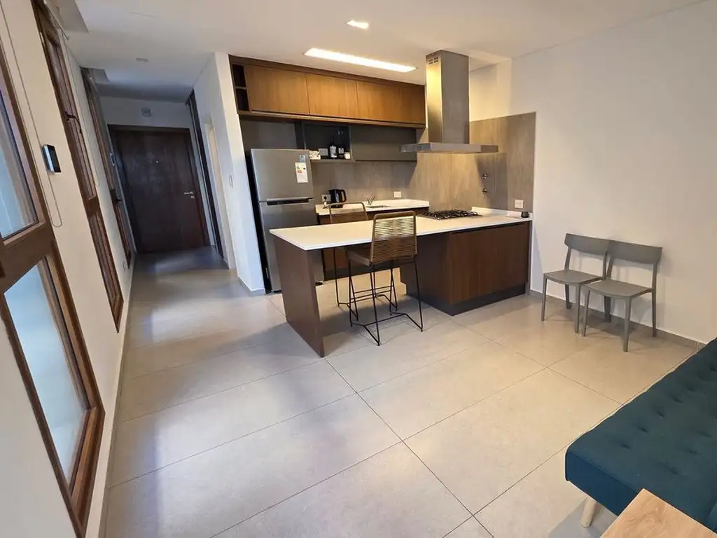 Departamento de un dormitorio, con un ambiente integrado de cocina y comedor, un dormitorio con placard , calefacción por losa radiante, ubicado en un complejo exclusivo que cuenta con pileta, sum y terrazas con vista al mar. Con cochera y baulera.