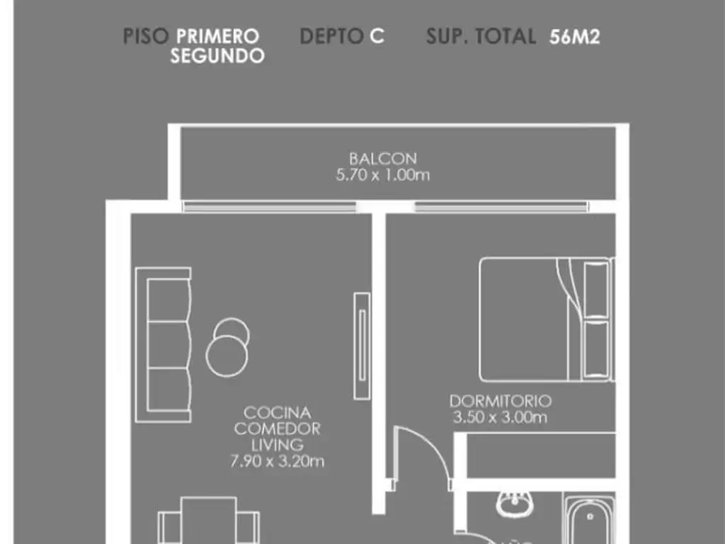 1 PISO "A" Y "B" FRENTE, 2 AMBIENTES CON BALCON DOBLE, SUP CUB. 56M2