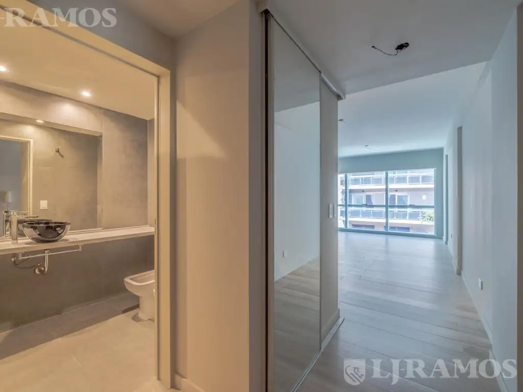 Pisos de porcelanato, ventanas de aluminio anodizado con doble vidrio hermético, mesadas de Silestone, anafe y horno eléctricos, puertas de placares y muebles de cocina bajo mesada y alacenas completos.