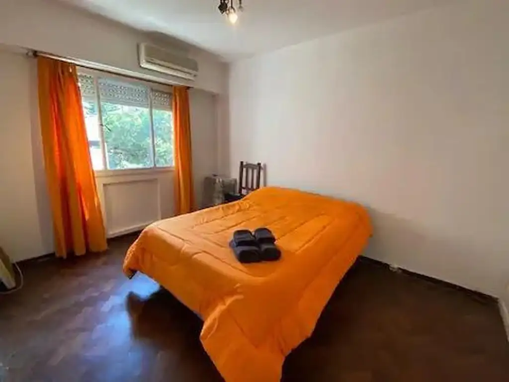 El dormitorio es amplio, con placar que ocupa toda una pared, y hasta el techo. Tiene piso de parquet y la ventana da al pulmón de manzana con jardines.