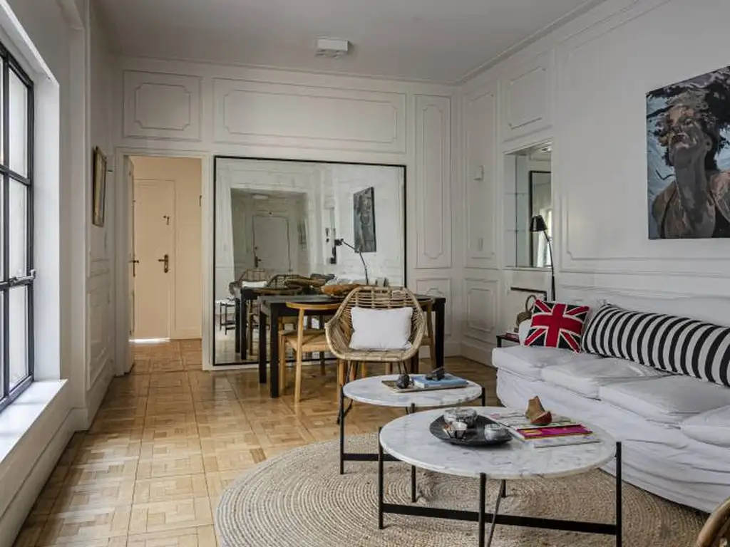 Hall de entrada, living, comedor y escritorio/playroom. Tres dormitorios, dos a balcón al frente y el tercero al aire y luz. Principal en suite con vestidor hoy reconvertido en escritorio. Segundo baño completo. Cocina amplia con lavadero incorporado. Dependencia de servicio con baño que puede ser reconvertido a toilette.