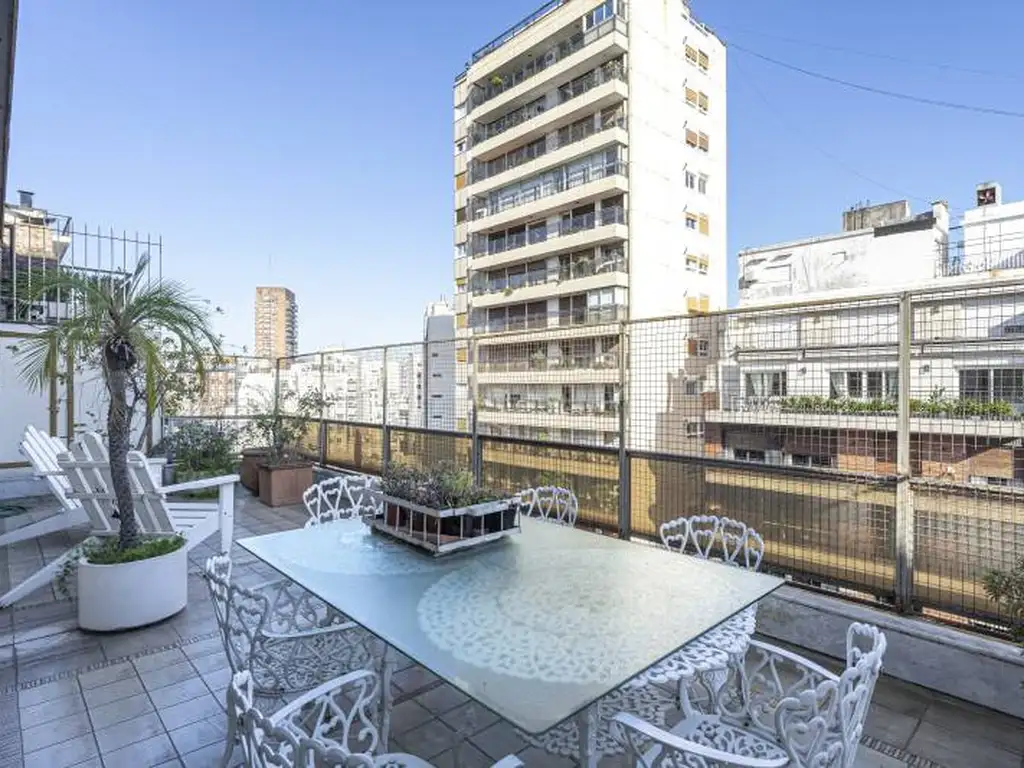 Palier privado, doble living apaisado y comedor aparte. Salida a balcón terraza al frente. Toilette de recepción. Cocina amplia, con ventilación natural, comedor diario, lavadero y dependencia de servicio. En el contrafrente gran dormitorio en suite, que puede ser un estar, escritorio o dormitorio con gran sector de placards. Subiendo la escalera se accede por un lado a la terraza de uso exclusivo con quincho cerrado con parrilla, espacio descubierto y sauna. Hacia el otro extremo dos dormitorios, uno de ellos en suite y un baño completo aparte. Ambos salen a un balcón corrido al frente. Estar amplio en el sector de acceso a dormitorios. Tercera planta: Dos dormitorios, uno en suite y el otro con baño completo compartimentado, los dos con salida a balcón corrido. Vistas desde el frente y el contrafrente. 2 cocheras fijas a las cuales se acceden a traves de un montacarga. Cuarto baulera de gran tamaño.