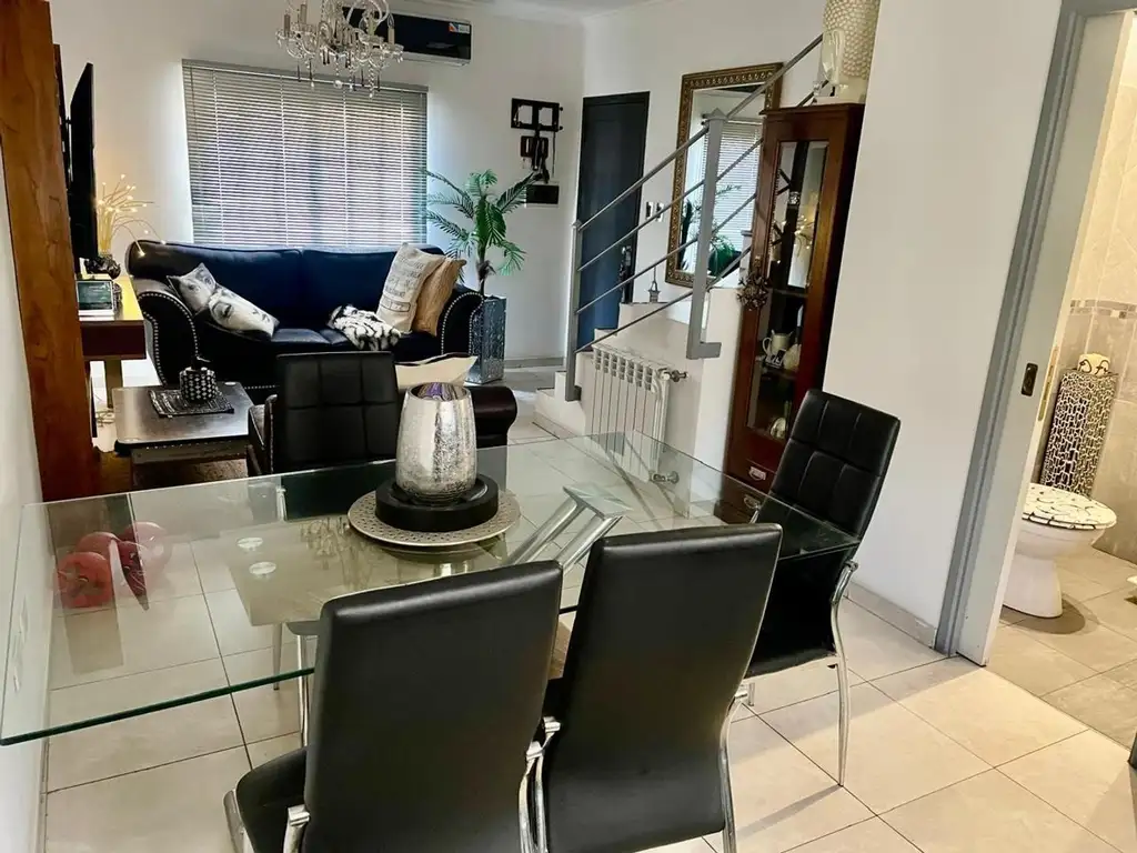 INGRESO MEDIANTE COMODA ESCALERA A PRIMER PISO A UN AMPLIO LIVING COMEDOR CON COCINA INTEGRADA CON BAJO Y SOBRE MESADA, ARTEFACTO DE COCINA, CAMPANA Y AIRE ACONDICIONADO, DOBLE VENTANA Y BALCON FRANCES; TOILETTE DE RECEPCION Y LAVADERO INDEPENDIENTE CON CALDERA DUAL Y ALACENAS; EN PLANTA ALTA PRIMER DORMITORIO AMPLIO CON PLACARD Y AIRE ACONDICIONADO, SEGUNDO DORMITORIO CON PLACARD Y BAÑO COMPLETO CON BAÑERA.
