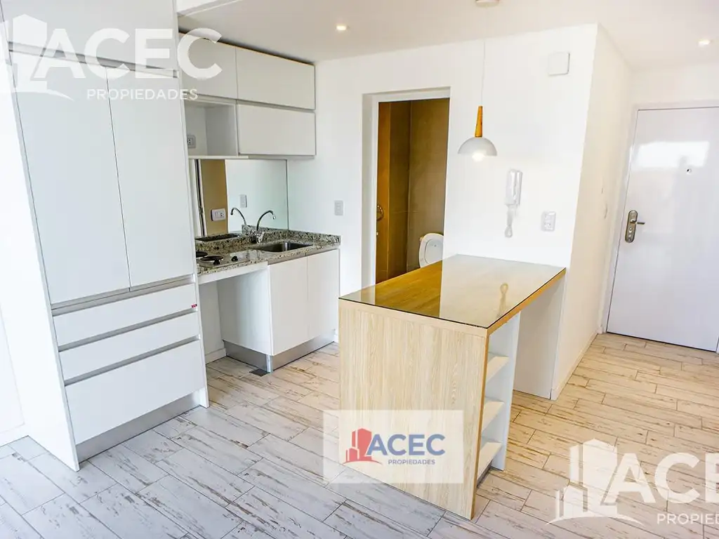 La unidad se compone de un espacio único con cocina integrada y equipada, barra desayunador, con cajoneras