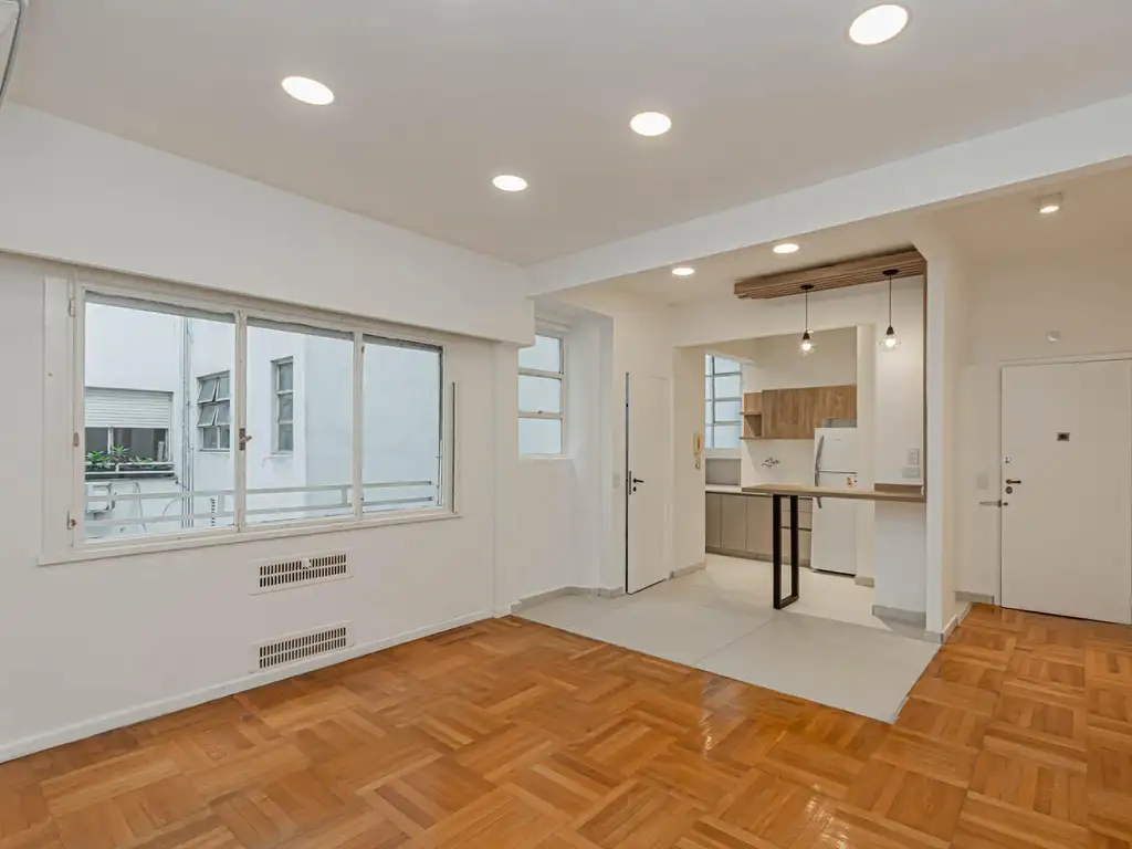 El departamento es de dos ambientes recién reciclado. Está recién pintado. Dormitorio principal con placard, baño completo hecho a nuevo. Living- Comedor. Muy buena Cocina con barra con espacio de guardado. Toilette. Posee 2 aires acondicionados, uno en el dormitorio de 3500W y otro en el living de 5300W, ambos son Frio/ Calor.