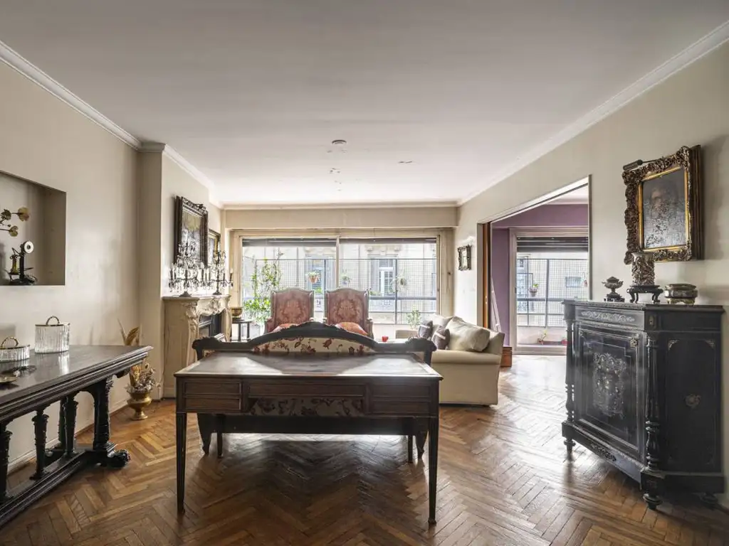 Departamento en venta en Recoleta a reciclar. Semipiso con palier privado. Hall de entrada. Living-comedor y escritorio integrados, con salida a balcón corrido. Toilette de recepción. Habitación principal al frente. Dos dormitorios al aire luz. Dos baños completos. Cocina con comedor diario. Dos dependencias de servicio con baño. Lavadero. Pisos de Parquet. Calefacción central. Baulera. Dos cocheras fijas. La presente oferta de venta está condicionada a la confección del COTI por parte del propietario. (Res.AFIP 2371). Las medidas son aproximadas y orientativas. Las medidas exactas surgirán del título de propiedad.