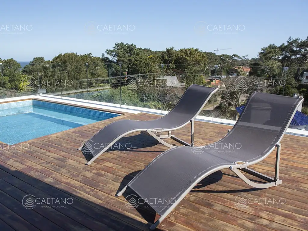 Solarium y terraza equipados con reposeras, camastros y sombrillas.