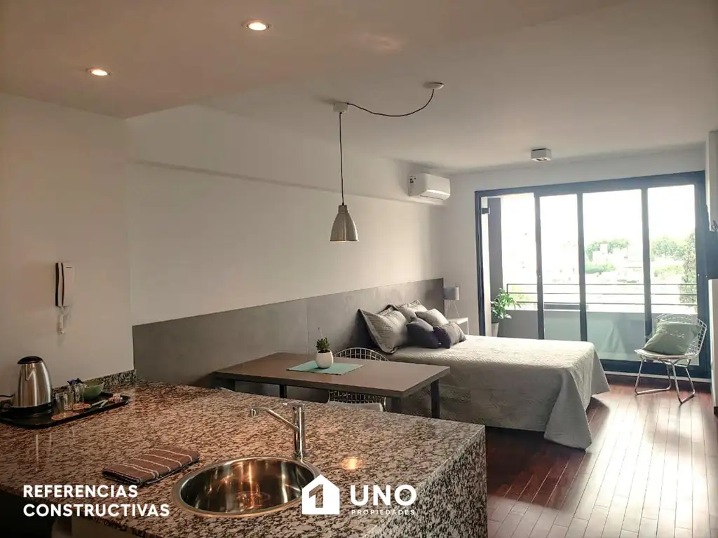 Departamento con gran patio de 24 m2, entrega en Agosto de 2028. Ambiente único con la cocina equipada, desayunador, espacio de guardado y baño.