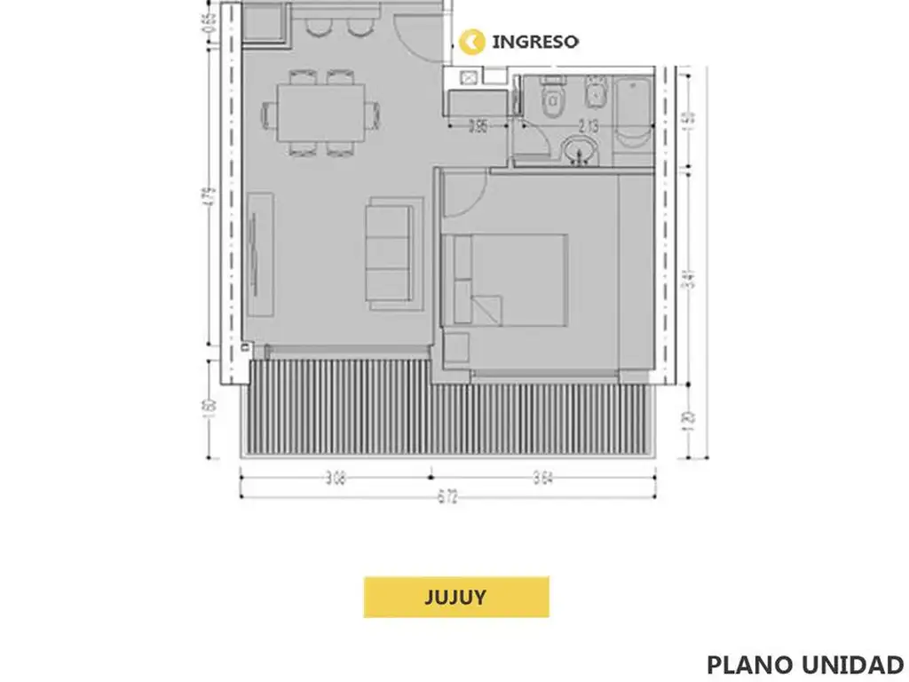 Estar comedor con cocina integrada y barra desayunadora. Balcón corrido al frente sobre calle Jujuy. Dormitorio con placard y acceso al voladizo. Baño completo.
