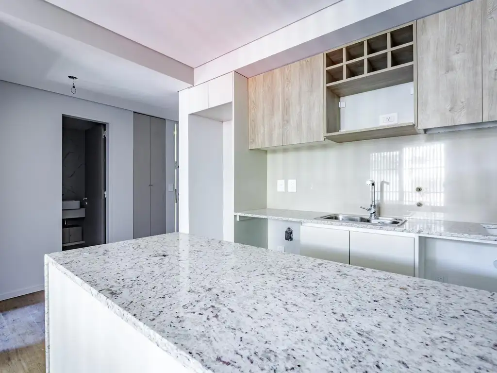 * Mesada en granito con bacha en acero inoxidable.
