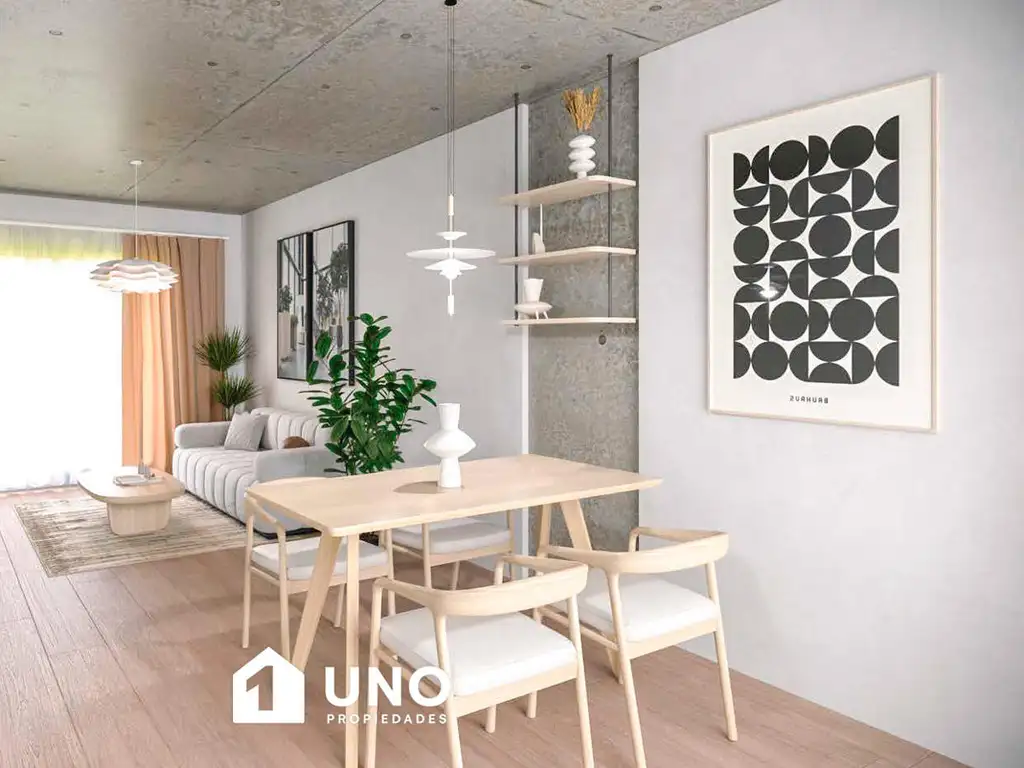 Acceso a un luminoso estar/comedor con salida al balcón al frente, integrado a una moderna cocina con doble mesada.