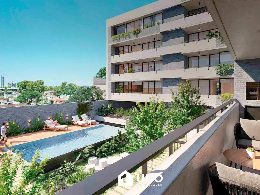 El complejo Giardino ofrece un jardín central con abundante y colorida vegetación, además de una destacada variedad de amenities, servicios y espacios verdes: piscina, solárium, gimnasio, sala de coworking, espacios recreativos, terrazas, jardines y parrilleros.