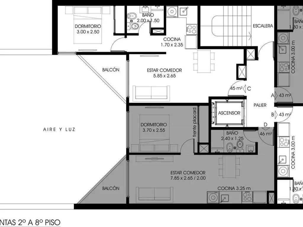 Distribución: Se accede por palier en planta a cocina comedor, living, por puerta balcón a dormitorio con frente en placar con balcón y baño completo.
