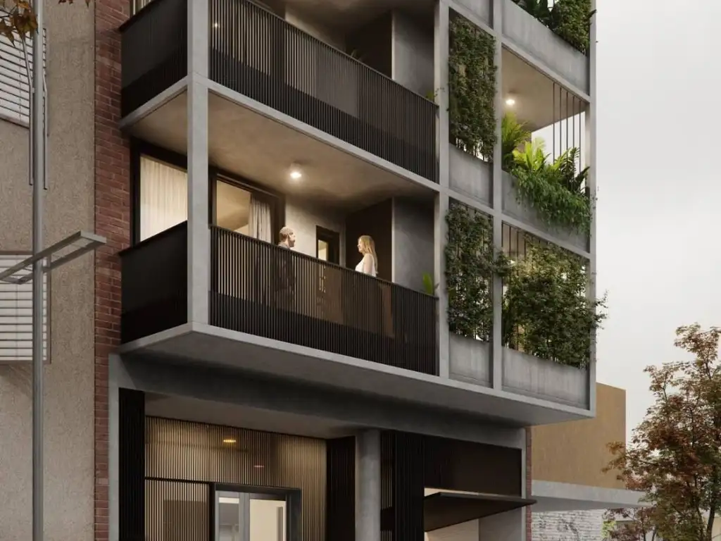El edificio incluye monoambientes, unidades de 1 y 2 dormitorios, espacios de estacionamiento en planta baja y bicicleteros. En la azotea, se encuentra un quincho de uso común y un espacio de solárium con duchas. Fecha de entrega estimada para segundo semestre de 2027