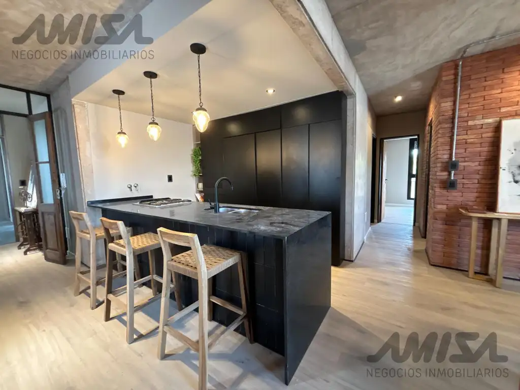 Departamento de 2 dormitorios con amplio balcón-terraza. Excelente calidad constructiva con pisos flotantes de madera en combinación con porcelanato, aberturas de aluminio negras con DVH, preinstalación para A/A, caldera y radiador, instalación eléctrica a la vista con estilo industrial, placares con frentes colocados, paredes de ladrillos vistos y detalles en hormigón, en combinación con algunos cielorrasos en yeso, e iluminación exterior colocada. Cocina con mobiliario de cocina completo, alacena, bajo mesada, espacio técnico para heladera, bacha de acero inoxidable, mesada de granito negro, horno, anafe e instalación para lavarropas. Baño con loza sanitaria y griferías de primera marca, mesada de terrazo con bacha de cerámica, espejo y accesorios colocados, revestimiento acorde en paredes, mampara de vidrio y preinstalación para extractores.
