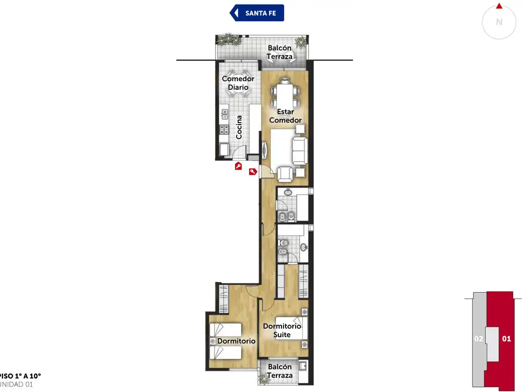 Gran semipiso orientado al norte con Ventilación Cruzada y doble ingreso, entrega en Julio de 2026. El 1º ingreso es por el estar/comedor con balcón terraza a la calle, mientras que el segundo ingreso es por la cocina, esta se encuentra separada del estar y está completamente equipada, además cuenta con vista al frente, desayunador y comedor diario. El área de dormitorios, se encuentra separada del estar, la habitación suite dispone de vestidor, baño privado y balcón/lavadero al contrafrente sur. Hay dos baños completos con bañera y ventilación natural.