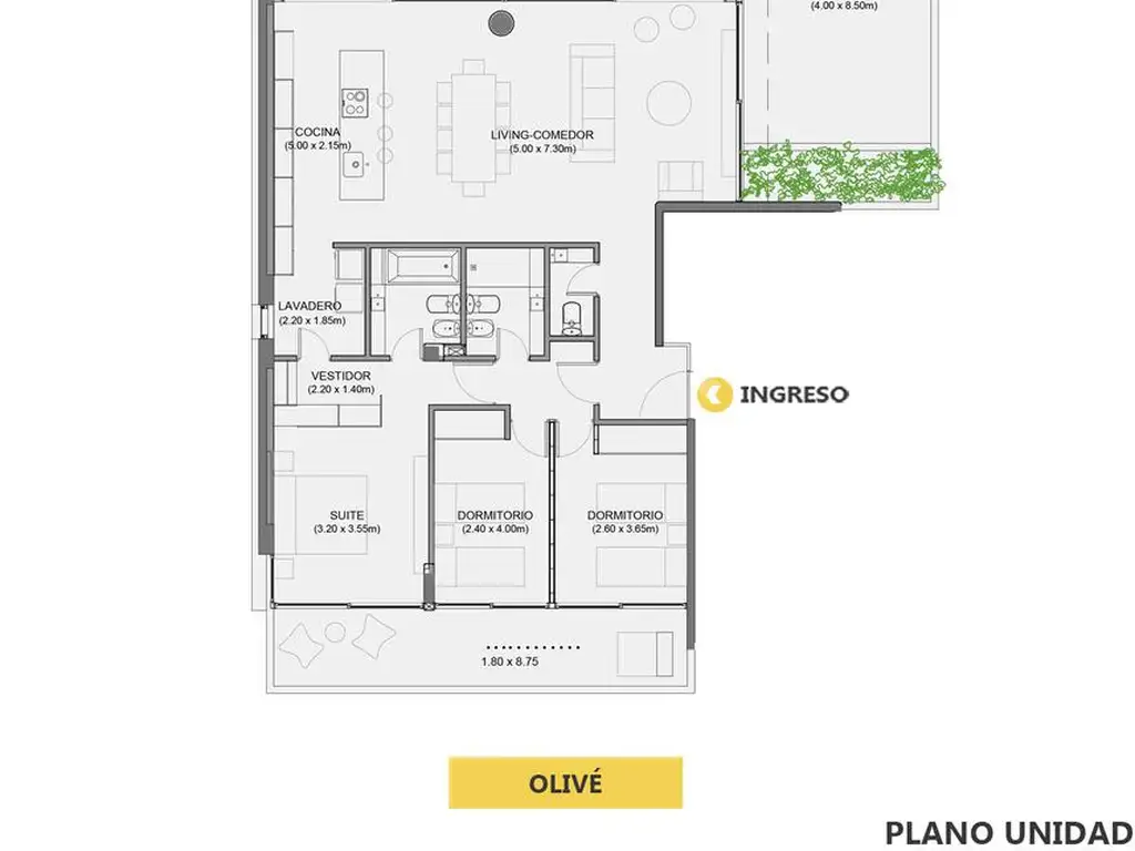 Cocina incorporada en isla y acceso a terraza exclusiva con cantero forestado. Toilette.