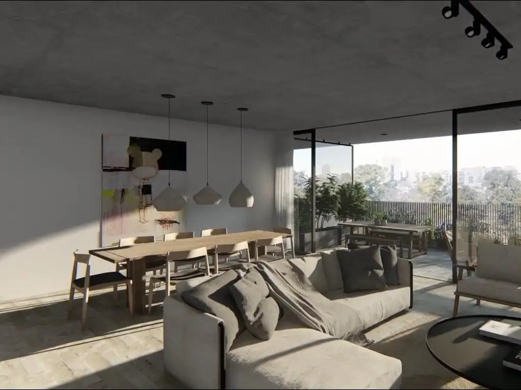 *Amplio living apaisado con ventanales de piso a techo y salida a un balcón aterrazado con vista abierta al parque.