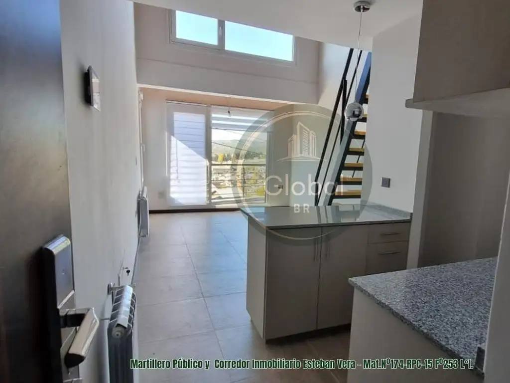 Recorrido: Al ingresar, encontramos la cocina con espacio para heladera y lavarropas. Hacia la derecha se ubica un placard y el baño, el cual es con ducha. El living-comedor es integrado con amplia luz natural, ventanal con balcón con vista hacia el lago Nahuel Huapi. Accediendo por la escalera se encuentra la habitación.