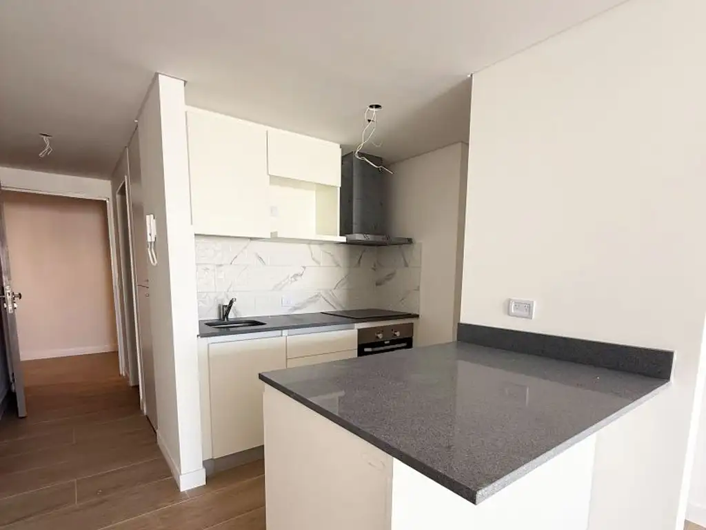 Cocina integrada con muebles altos y bajos, mesada tipo silestone, con horno y hornallas vitrocerámicas eléctricas.