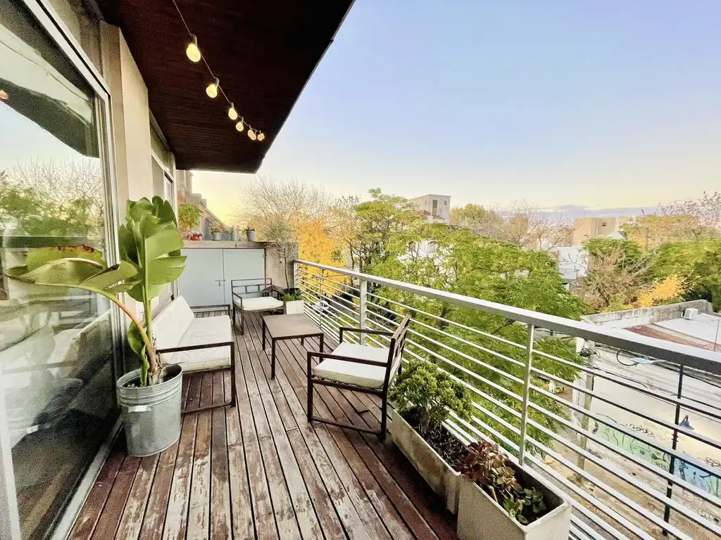 Es un dos ambientes enorme, con varios espacios para disfrutar: Cocina con barra, Comedor, Living y Escritorio (o posibilidad de armar vestidor), todo con salida a gran Balcón con vista abierta (y muy linda visual de la parroquia). Luego se encuentra el dormitorio con placard y un baño completo compartimentado (con doble acceso).